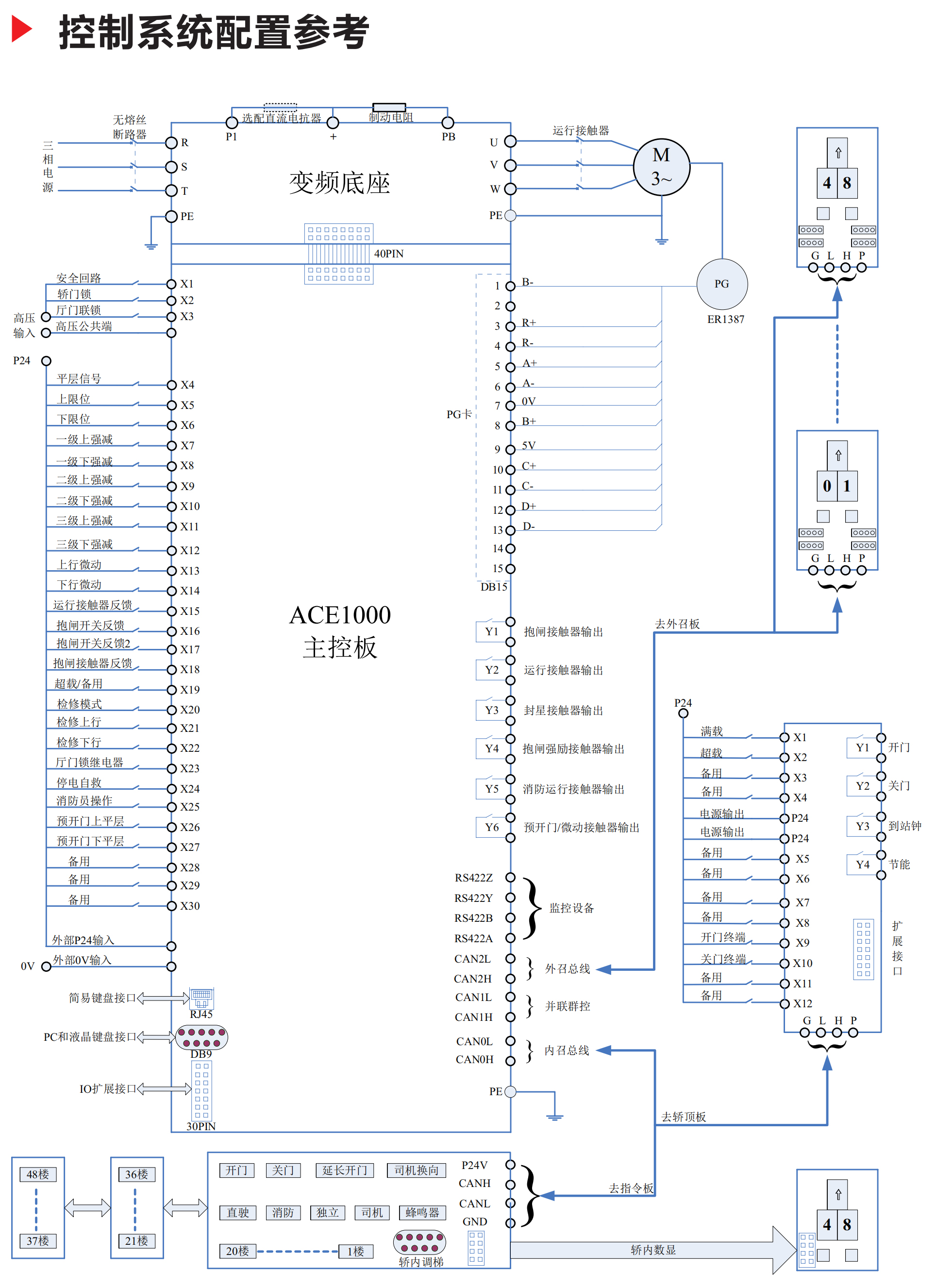 ACE1000電梯一體化控制系統(tǒng),它包含一體化主控板(含多種PG卡、IO擴(kuò)展板)、1.1KW~45KW變頻底座、轎頂控制板(含擴(kuò)展板)、轎內(nèi)指令板(含擴(kuò)展板)、多種轎內(nèi)數(shù)顯板及廣告機(jī)、多種廳外召喚板、轎內(nèi)語音板、簡(jiǎn)易鍵盤、中文液晶鍵盤、UCMP板、PC配套軟件、手機(jī)配套軟件等一整套完善的電梯控制系統(tǒng)解決方案。